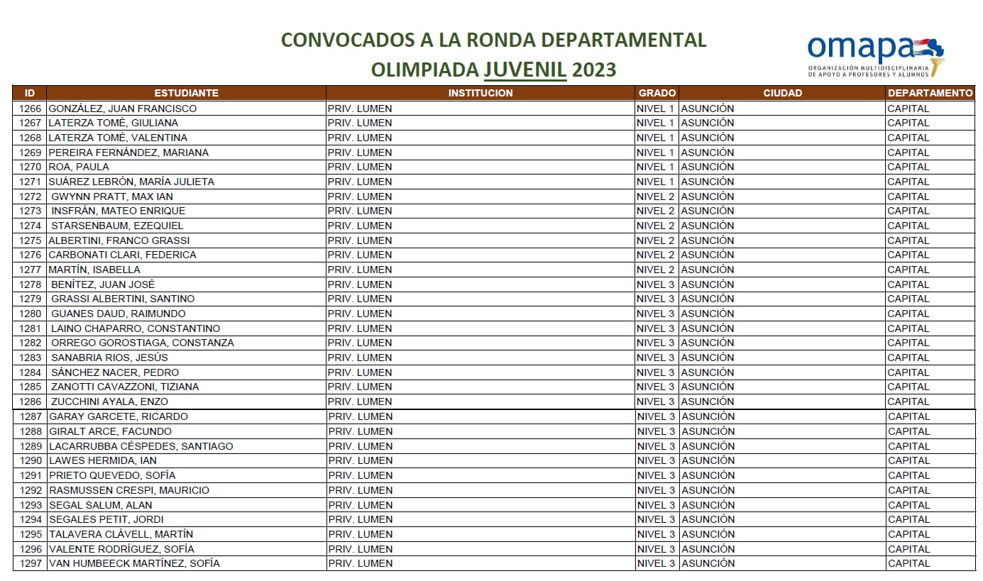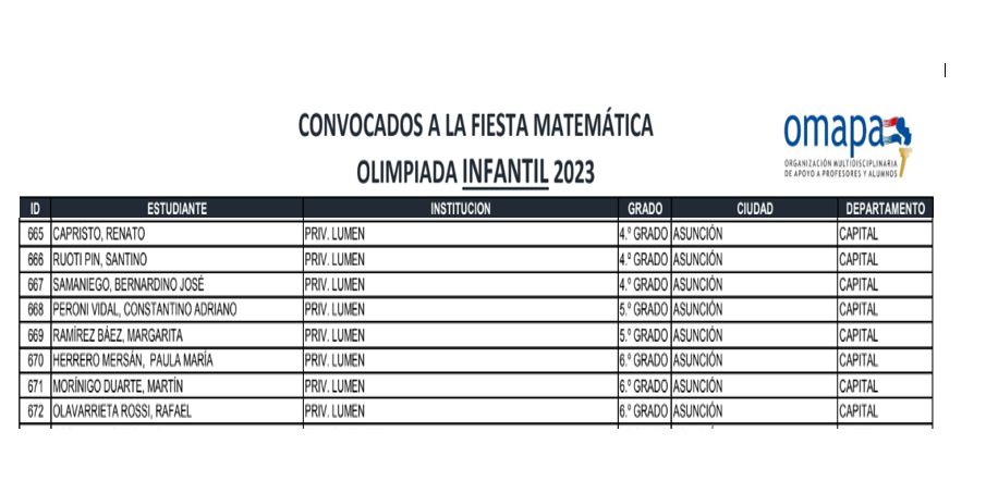 Nos complace comunicar que los siguientes niños clasificaron a la ronda final llamada «Fiesta matemática», la misma se llevará a cabo, el 2 de setiembre, en las sedes habilitadas, en los diferentes departamentos del país.
